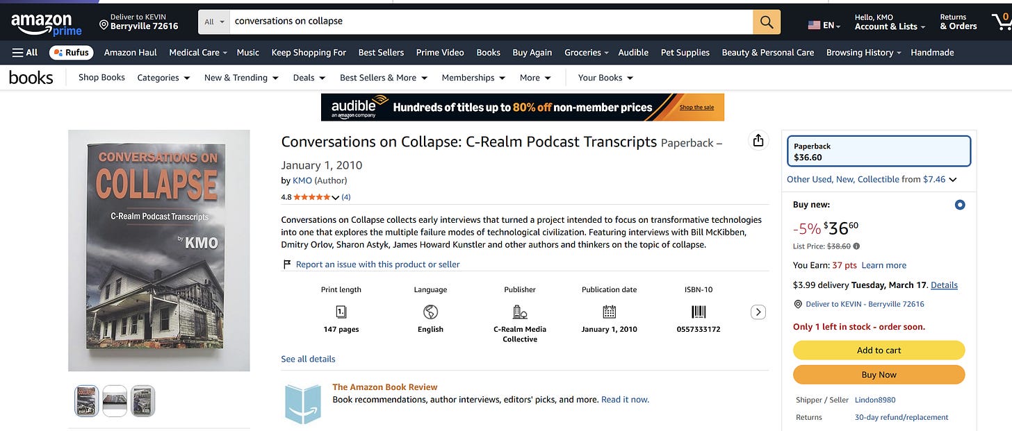 Looking back on it, it seems like a daunting undertaking, but once the mania seized me, the whole project came together in what feels like a few short weeks. At least that’s how I remember it now. Still, it had been an idle notion for a long while, then the spirit of completion animated me for a short period, and thereafter I had a stock of books that I could use as both the central prop and financial fuel for multiple cross-country couch-surfing speaking tours. That prop is the book Conversations on Collapse: C-Realm Podcast Transcripts. There was never a second printing, and used copies on Amazon.com are listed at silly prices.