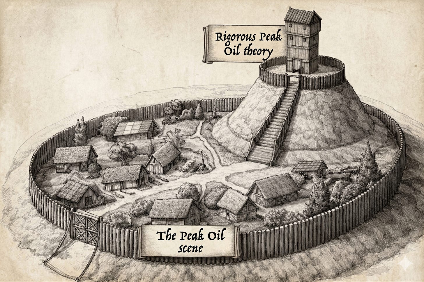 To claim that the Peak Oil movement failed because extraneous and unserious apocalyptic baggage weighed it down is something of a motte and bailey move. The rigorous and sober technical theory is the motte, the elevated stronghold. The popular movement that mixed technical analysis with vivid zombie apocalypse scenarios is the bailey, the collection of buildings inside a perimeter fence adjacent to the more secure motte. You can’t defend the legitimacy of the bailey by appealing to the rigor of the motte. The scene is down in the bailey. At least, it used to be.